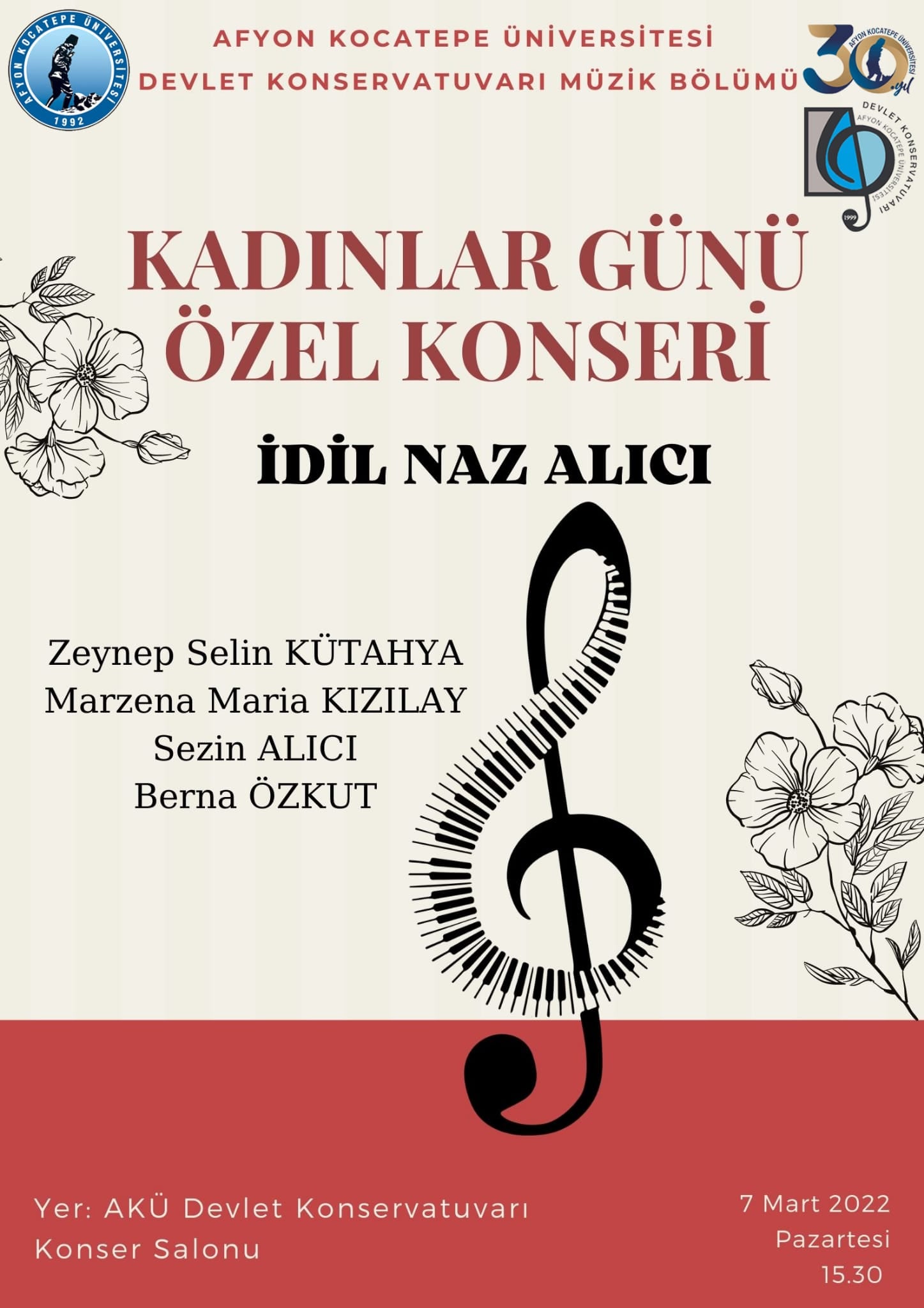 Afyon Kocatepe Üniversitesi Devlet Konservatuvarında 7 Mart 2022 tarihinde gerçekleştirilen Kadınlar Günü Özel Konserinde İdil Naz ALICI'nın eserleri seslendirildi.